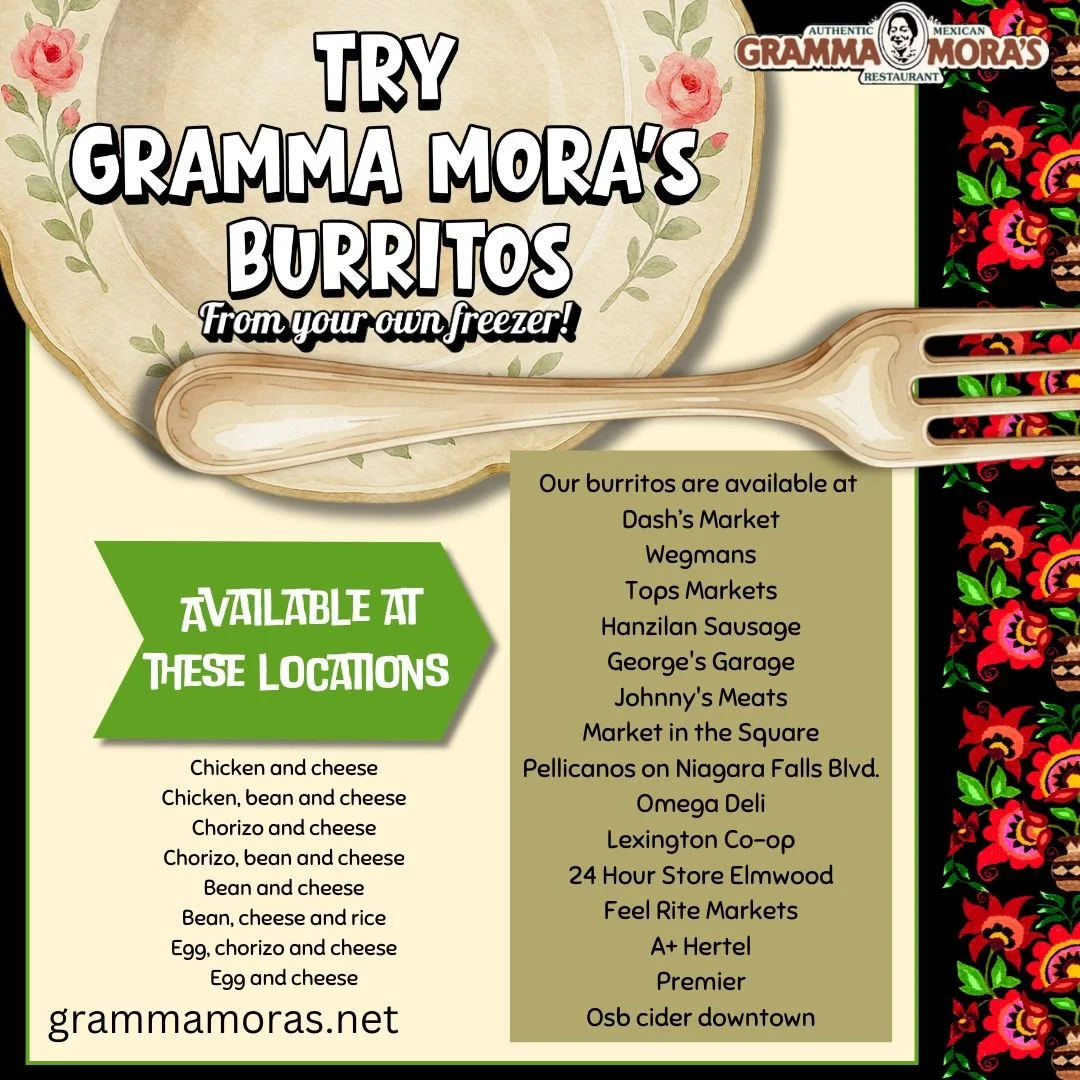 In 1994, Gramma Mora’s continued to grow their business with the launch of their own frozen premium gourmet burritos sold in local stores across the Buffalo region. The burritos are handmade with all the freshest homemade ingredients including the most tender part of the chicken, whole pinto beans, and homemade chorizo sausage. Each burrito is individually wrapped in microwave safe plastic with nutritional and ingredient information on the back of the packaging.